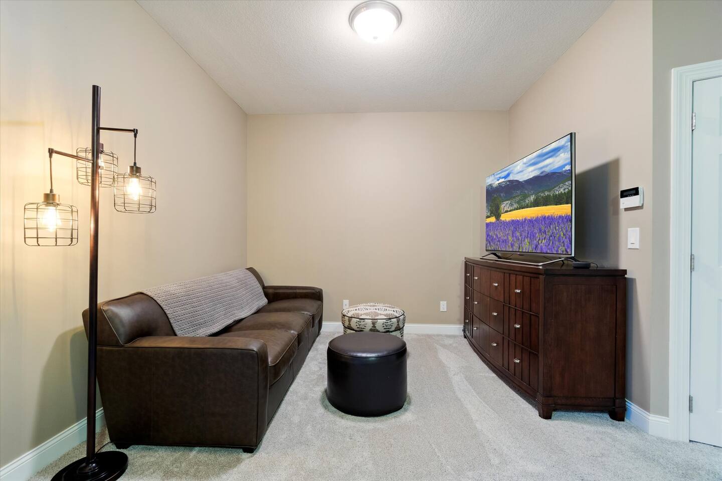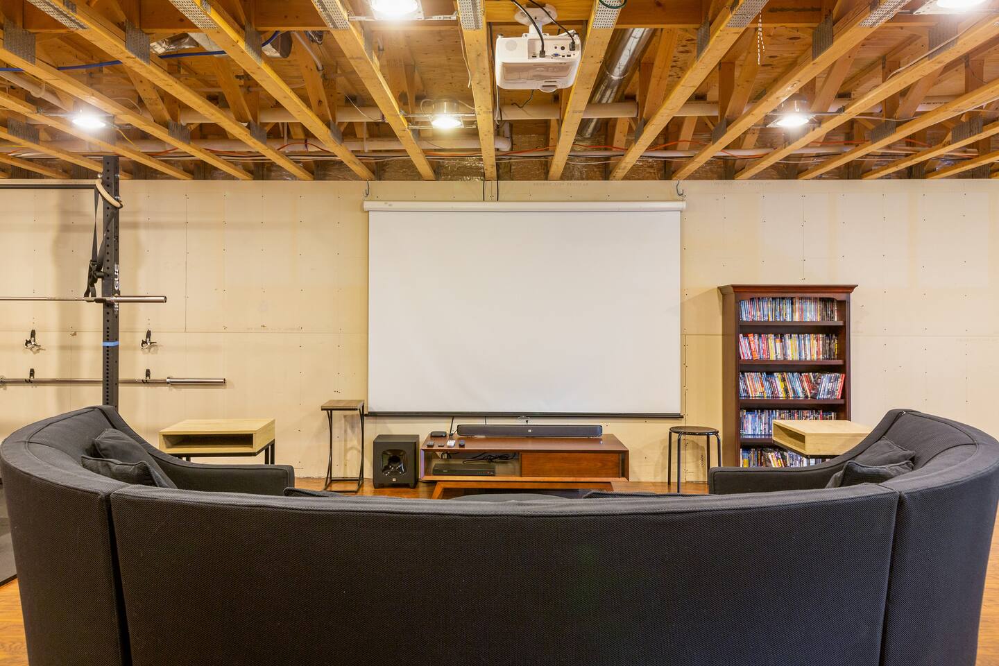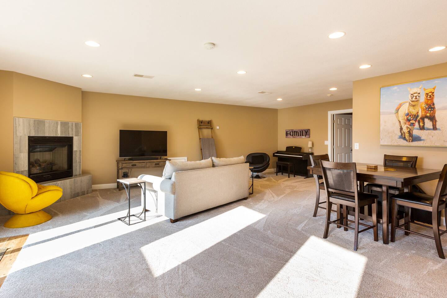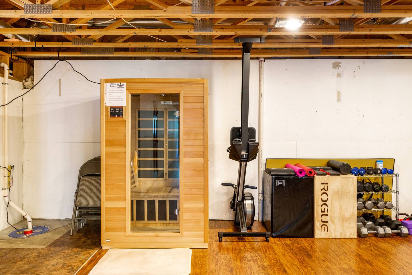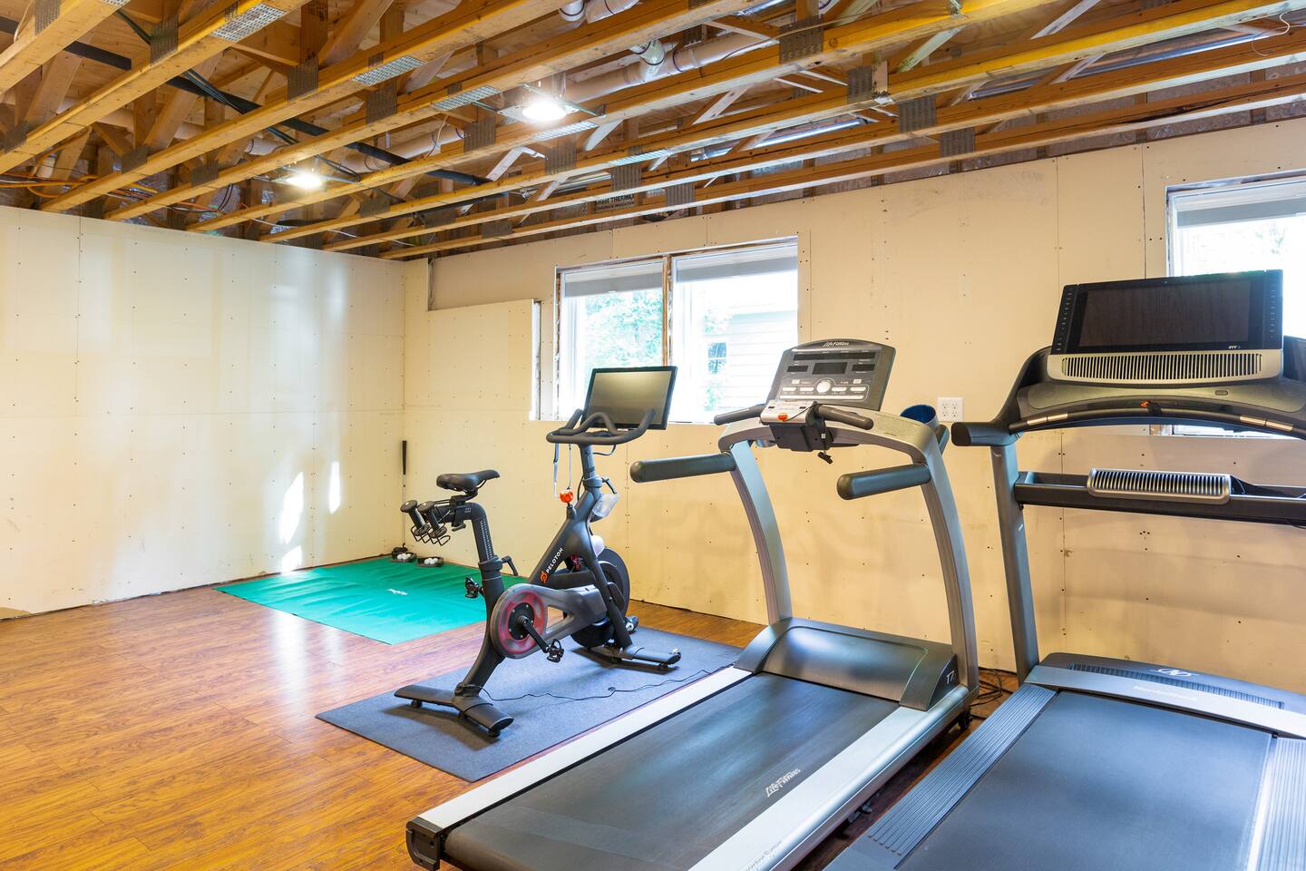 Open spaces with amazing lake views from both owner’s suites, main level living room and basement living room. The basement has two main spaces, a finished living room with a fireplace, 55” 4K TV, game table… and a partially finished recreation room that is just over 1,000 sq ft with amazing gym equipment, a two-person sauna, and a large sectional to watch movies on the 98” projection screen.