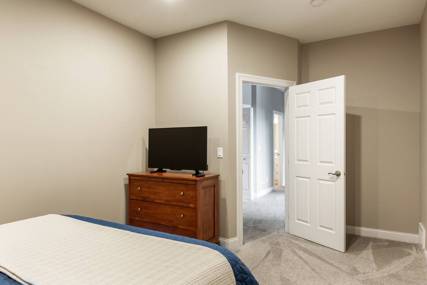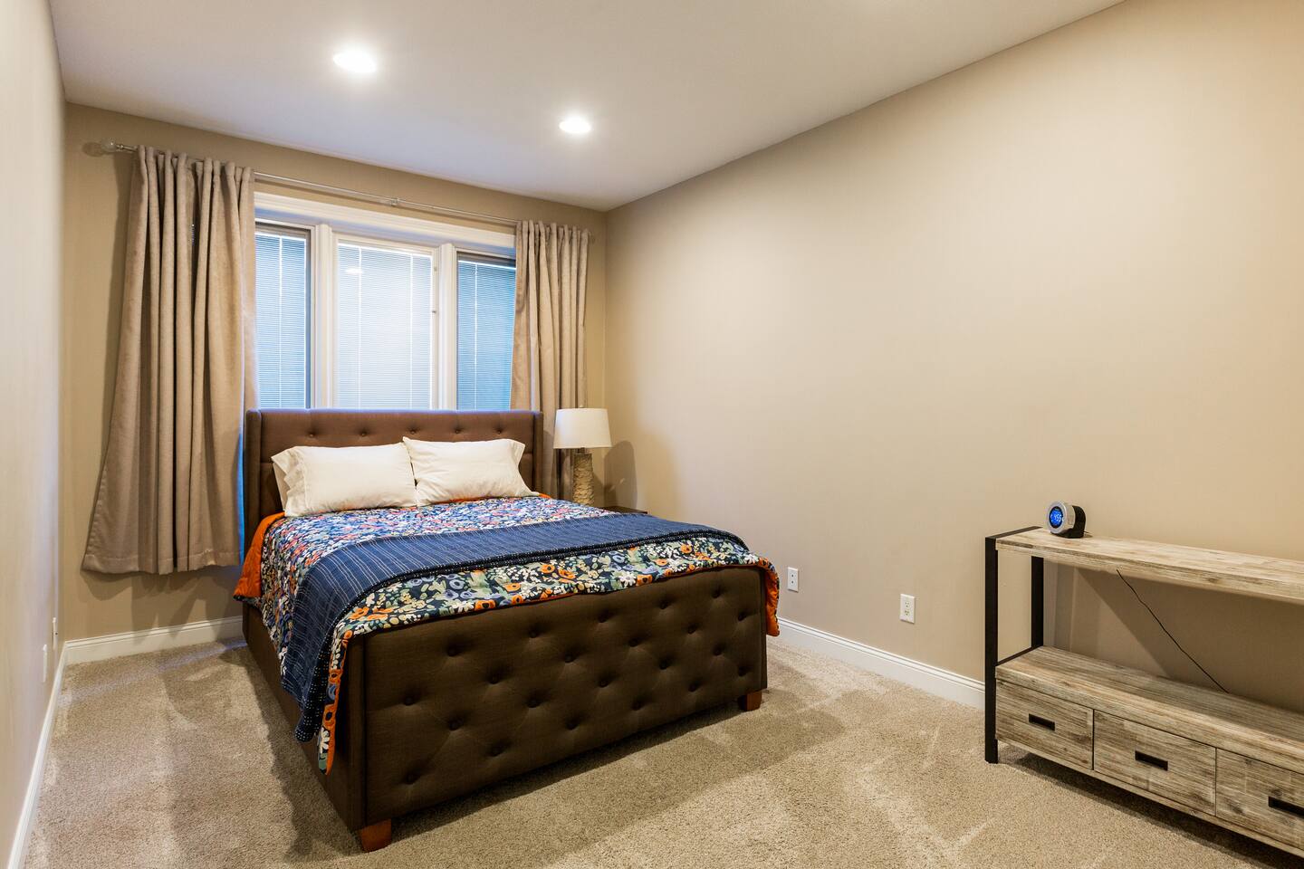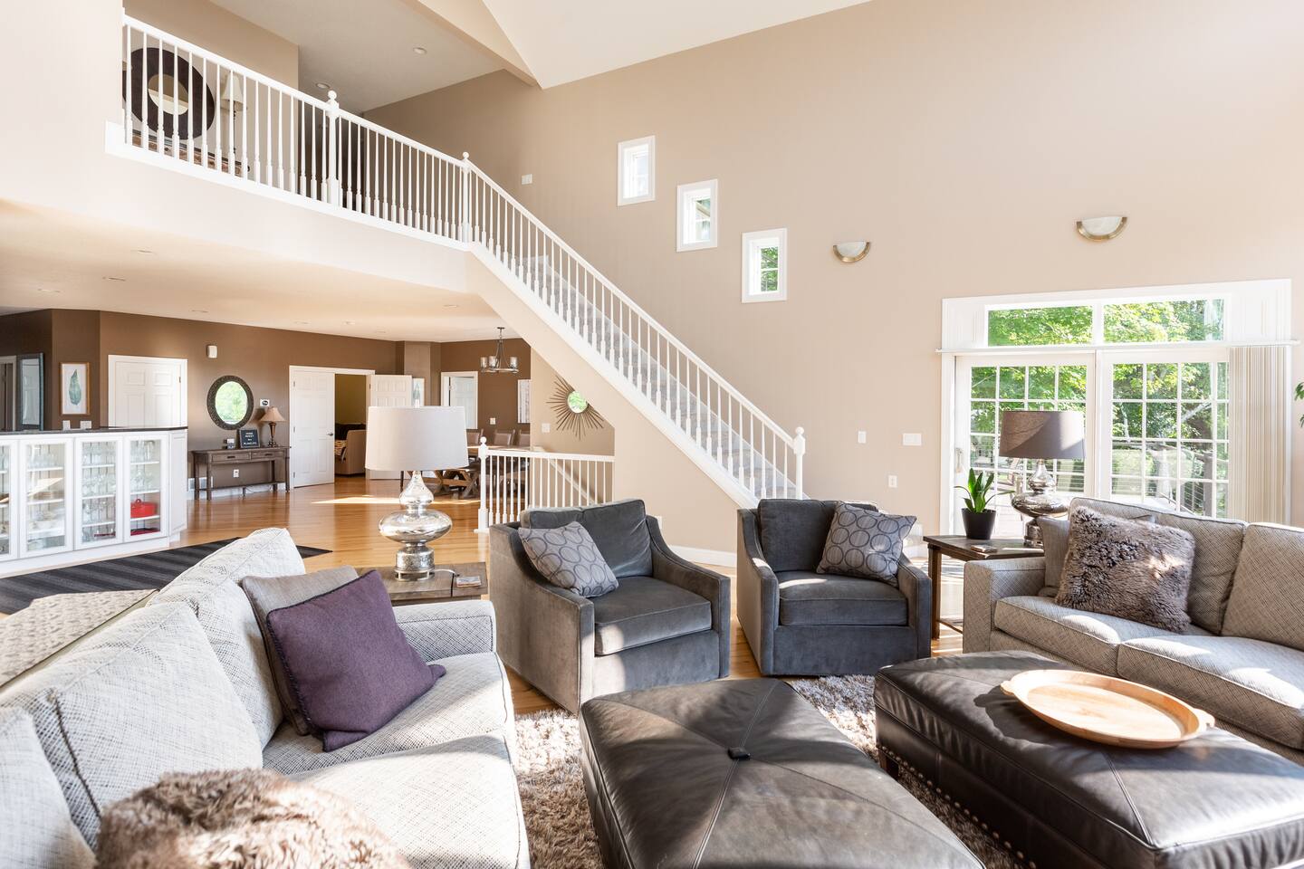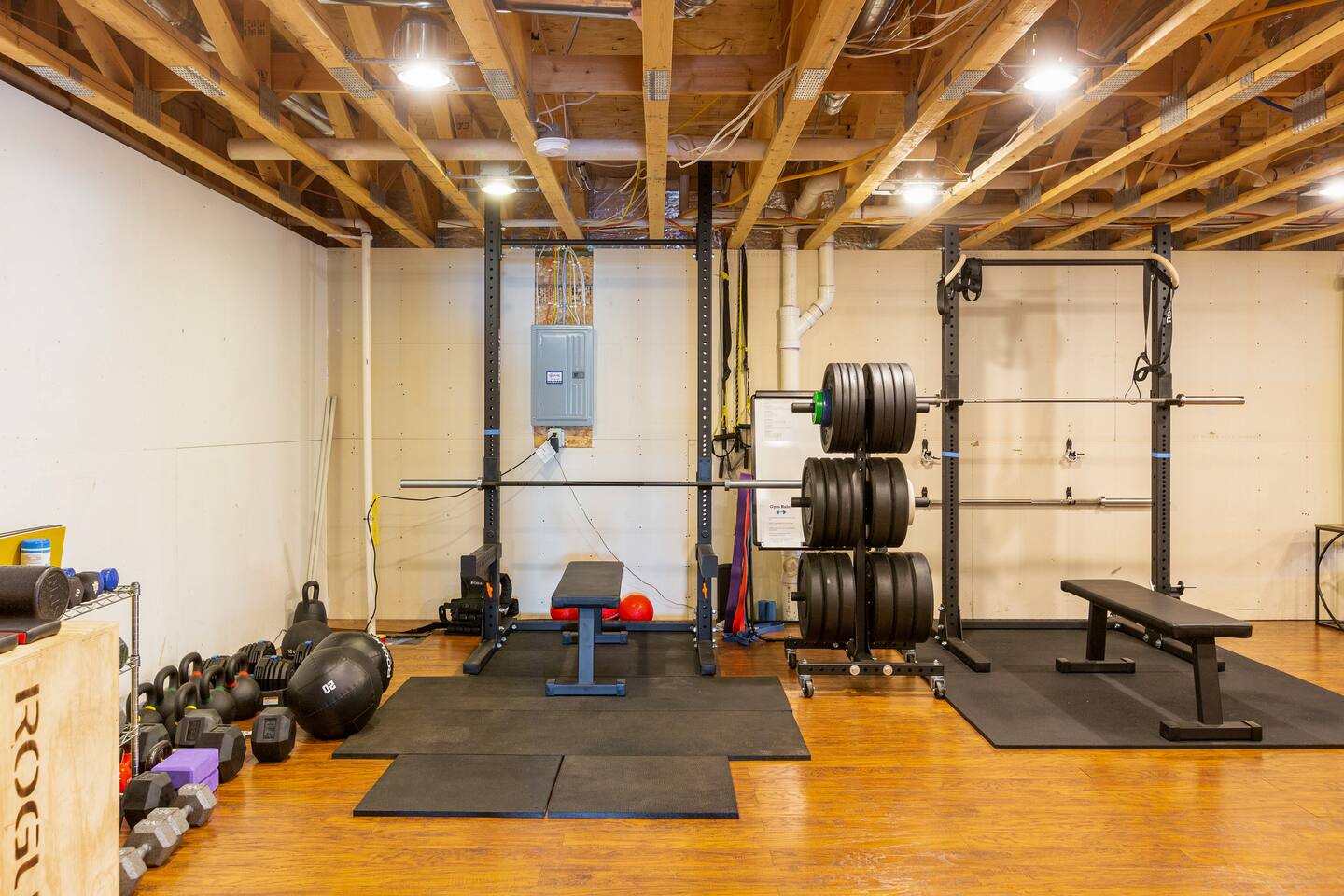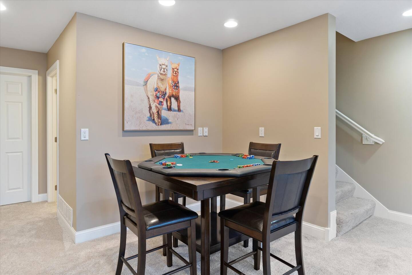 Open spaces with amazing lake views from both owner’s suites, main level living room and basement living room. The basement has two main spaces, a finished living room with a fireplace, 55” 4K TV, game table… and a partially finished recreation room that is just over 1,000 sq ft with amazing gym equipment, a two-person sauna, and a large sectional to watch movies on the 98” projection screen.